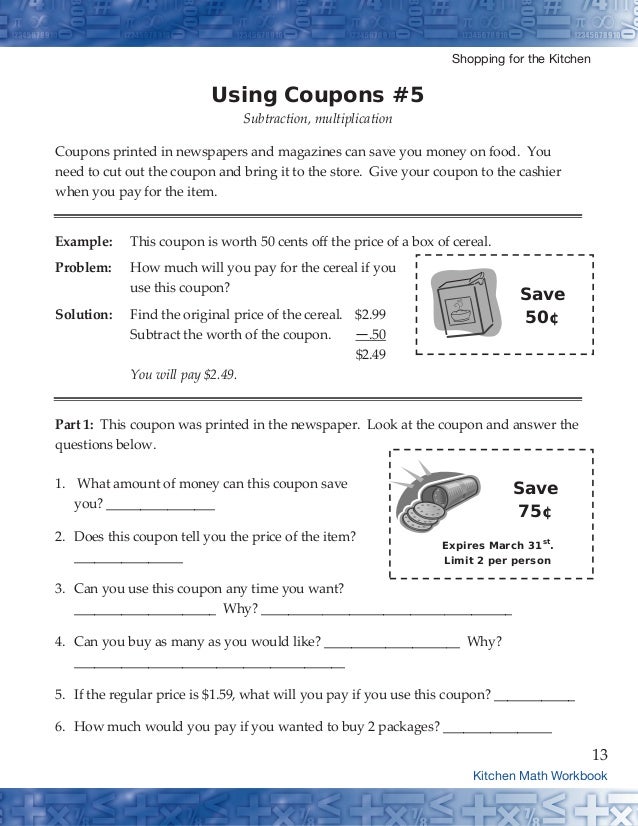 Math worksheets using coupons. Consumer Math, Spending Money, Worksheets, Lesson Plans ... Students learn and practice their spending money skills by using these spending money worksheets, lesson plans, lessons, activities, and exercises. Spending money is an interesting topic to use to reinforce basic math skills such as addition, subtraction, multiplication, and other skills such as reading comprehension. Learn Math Fast System Volume I: Basic ... - amazon.com Volume 1 of the Learn Math Fast System teaches how to add, subtract, multiply and divide with a unique approach. Includes all lessons, worksheets and tests. The Answer Key is in the back of the book. The methods used make it possible for students to advance several grade levels in just one year. The EU Mission for the Support of Palestinian Police and Rule ... Oct 14, 2022 · EUPOL COPPS (the EU Coordinating Office for Palestinian Police Support), mainly through these two sections, assists the Palestinian Authority in building its institutions, for a future Palestinian state, focused on security and justice sector reforms. This is effected under Palestinian ownership and in accordance with the best European and international standards. Ultimately the Mission’s ... Kindergarten Math Workbook: Kindergarten and 1st Grade ... Kindergarten Math Workbook . Give your child a head start with our latest kinder learning book that teaches the basics of math to kids. Our Kindergarten Math Workbook for Kids is a great way for your little one to learn basic mathematical skills such as number recognition, addition and subtraction, decomposing numbers, telling time, money and ...